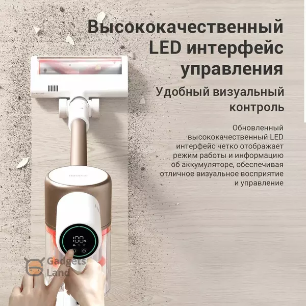 Интеллектуальный дисплей на ручке позволяет легко и быстро выбирать насадки и режимы уборки.